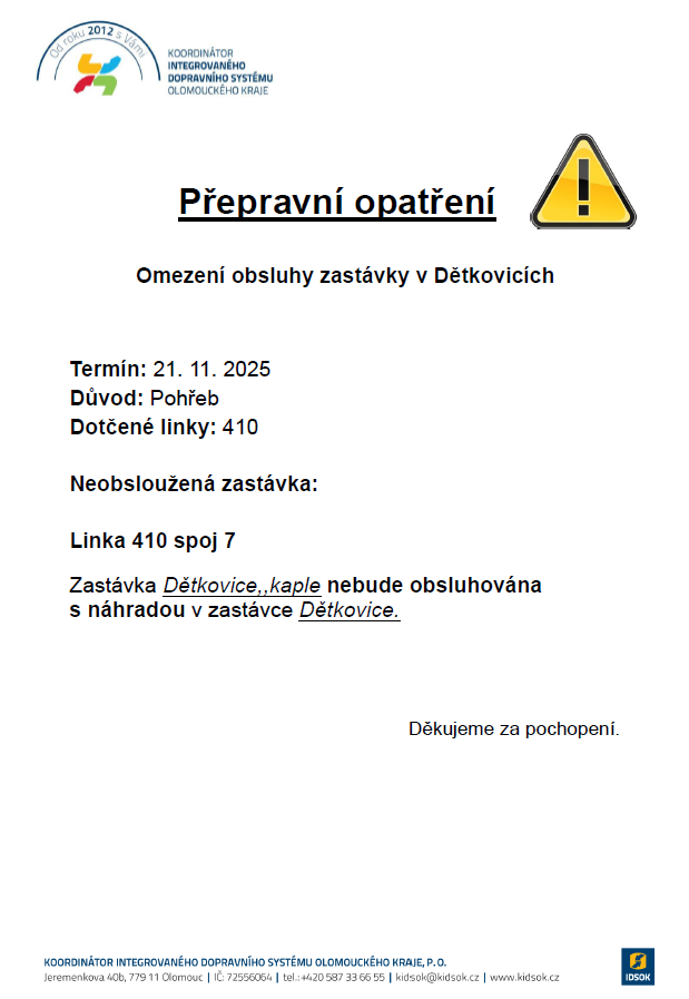 Informujeme občany, že z důvodu konání pohřbu v kapli sv. Anny nebude v pátek 21.11. ve 12.10 hod obsluhována zastávka Dětkovice, kaple (spoj 7, linky 410). Autobus pojede pouze na dolní zastávku.